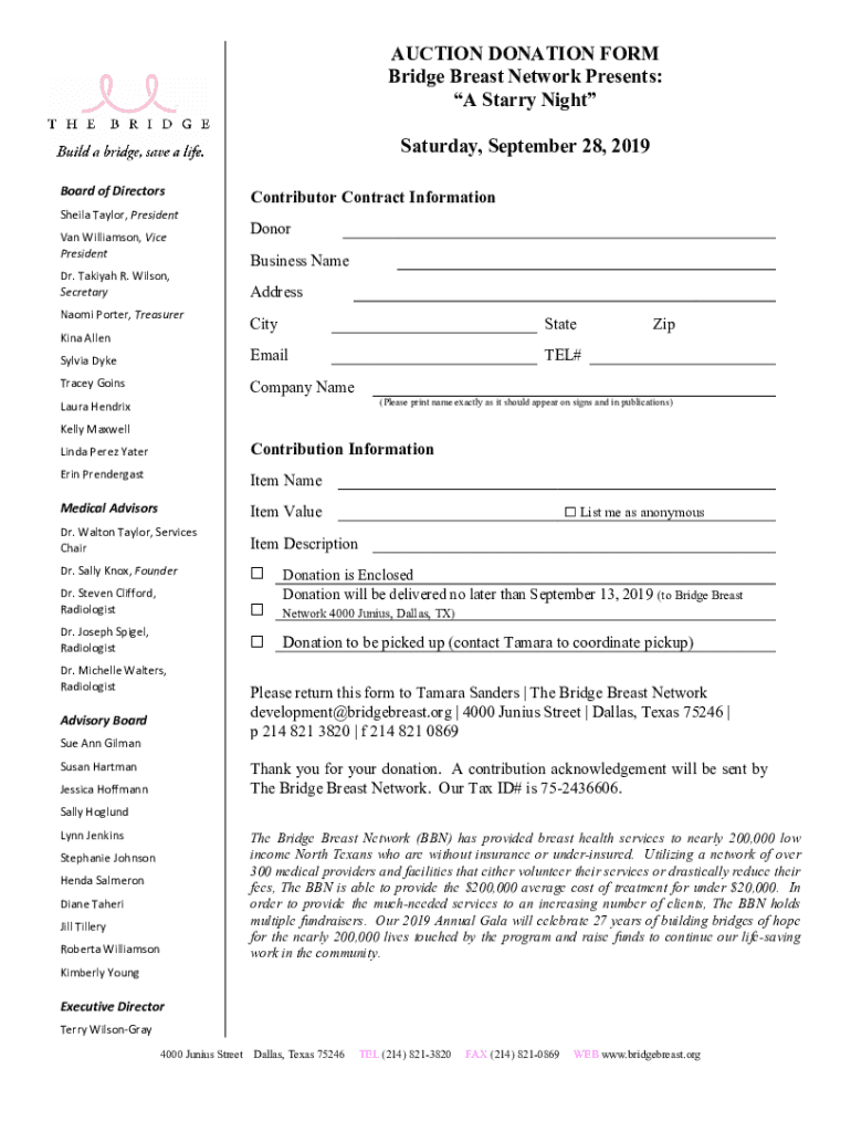 AUCTION DONATION FORM Bridge Breast Network Presents: A Starry Night Saturday, September 28, 2019, Board of Directors Sheila Taylor, President Van Williamson, Vice President Dr. Aliyah R. Wilson,