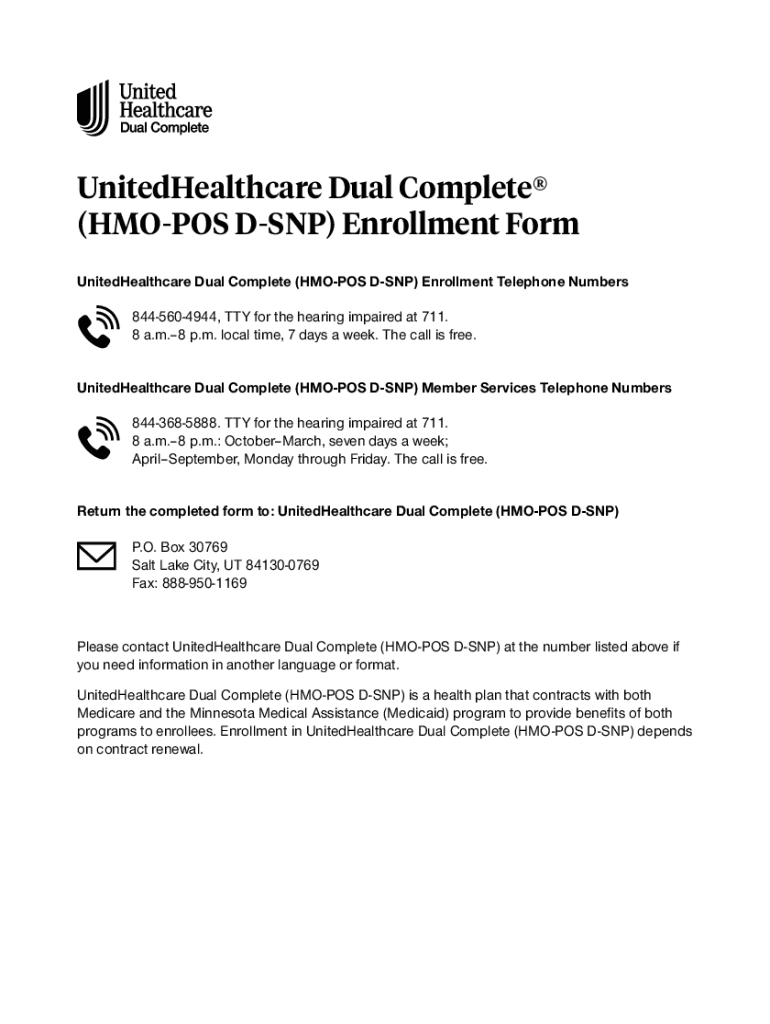UnitedHealthcare Dual Complete (HMO POS DSP) Enrollment Form UnitedHealthcare Dual Complete (HMO POS DSP) Enrollment Telephone Numbers 8445604944, TTY for the hearing impaired at 711. 8 a.m.8 p.m.