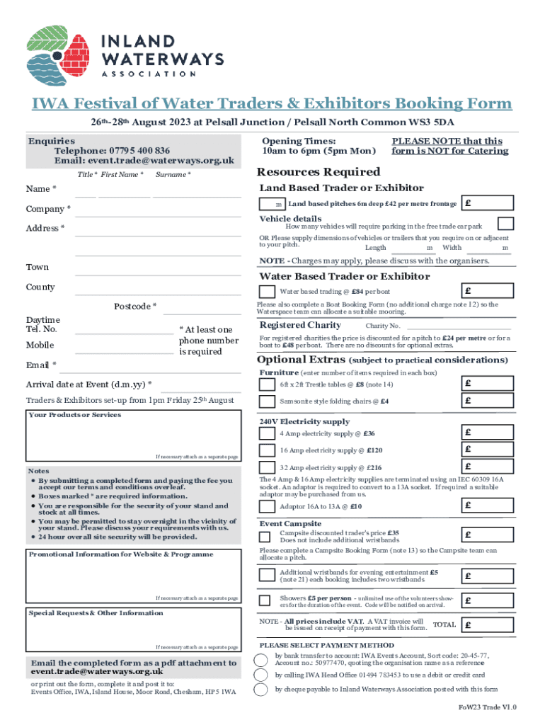 IRA Festival of Water Traders & Exhibitors Booking Form