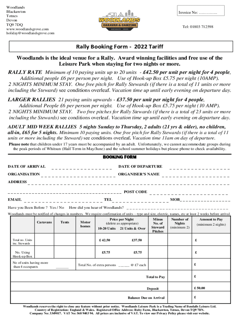 Woodlands Blackstone Tones Devon TQ9 7DQ www.woodlandsgrove.com holiday@woodlandsgrove.comInvoice No:. Tel: 01803 712598Rally Booking Form 2022 Tariff Woodlands is the ideal venue for a Rally. Award-winning