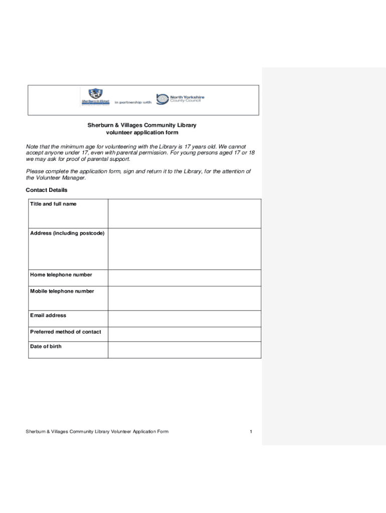 Hepburn & Villages Community Library volunteer application form Note that the minimum age for volunteering with the Library is 17 years old. We cannot accept anyone under 17, even with parental permission.