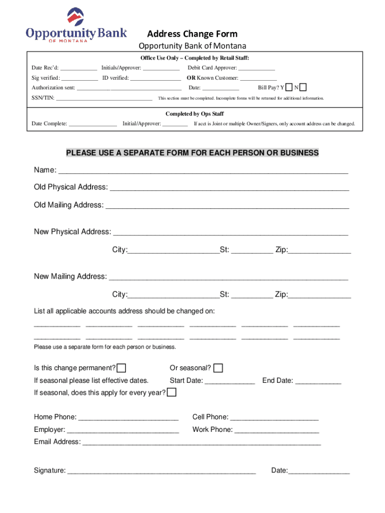Address Change FormOpportunity Bank of Montana Office Use Only Completed by Retail Staff: Date Recd: ___ Initials/Approver: ___Debit Card Approver: ___SIG verified: ___ ID verified: ___ OR Known Customer: