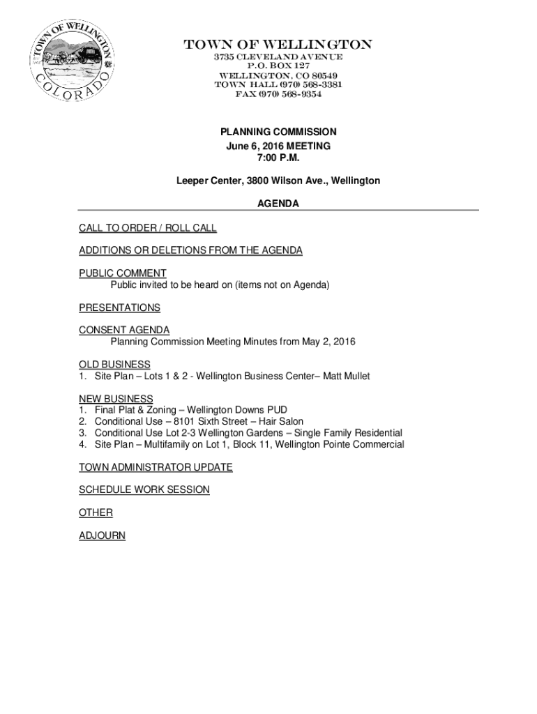 TOWN OF WELLINGTON 3735 CLEVELAND AVENUE P.O. BOX 127 WELLINGTON, CO 80549 TOWN HALL (970) 5683381 FAX (970) 5689354PLANNING COMMISSION June 6, 2016, MEETING 7:00 P.M. Deeper Center, 3800 Wilson Ave.,