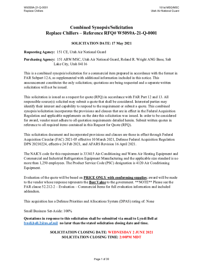 W50S9A21Q0001 Replace Chillers151st MSG/MSC Utah Air National GuardCombined Synopsis/Solicitation Replace Chillers Reference RFQ# W50S9A21Q0001 SOLICITATION DATE: 17 May 2021 Requesting Agency: 151