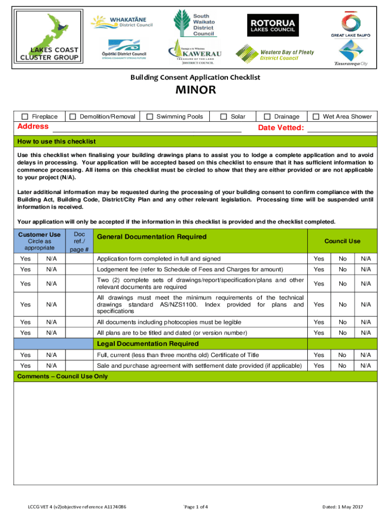 Building Consent Application ChecklistMINOR FireplaceDemolition/RemovalSwimming PoolsSolarAddress :Drainage Area Chordate Vetted:How to use this checklist Use this checklist when finalizing your building