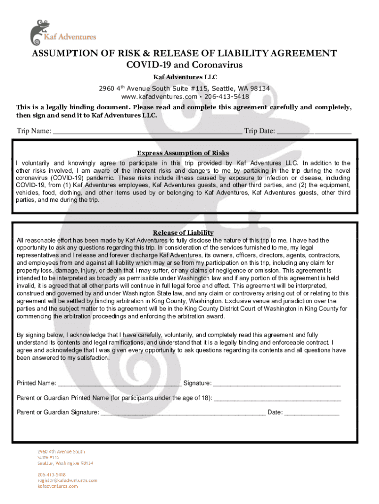 ASSUMPTION OF RISK & RELEASE OF LIABILITY AGREEMENT COVID-19 and Coronavirus Key Adventures LLC 2960 4Avenue South Suite #115, Seattle, WA 98134 www.kafadventures.com 2064135418thThis is a legally