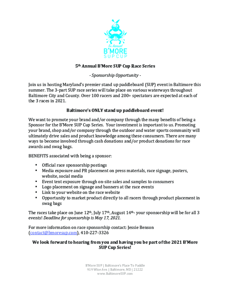 5th Annual More SUP Cup Race Series Sponsorship Opportunity Join us in hosting Maryland's premier stand up paddleboard (SUP) event in Baltimore this summer. The 3part SUP race series will take place