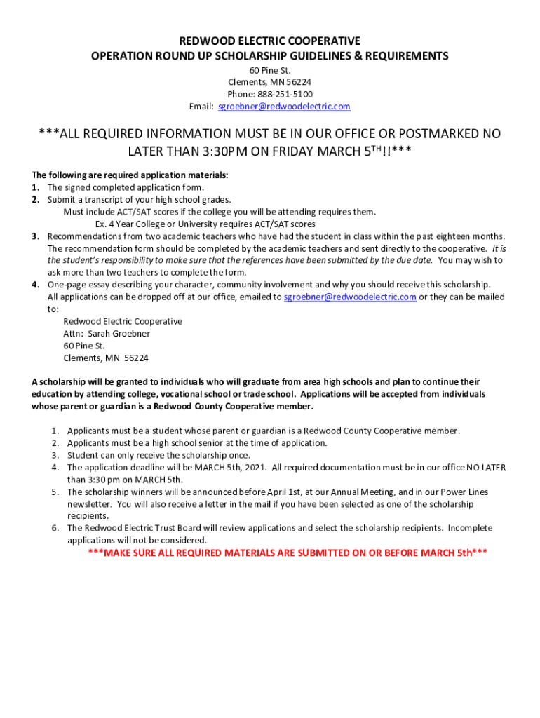REDWOOD ELECTRIC COOPERATIVE OPERATION ROUND UP SCHOLARSHIP GUIDELINES & REQUIREMENTS 60 Pine St. Clements, MN 56224 Phone: 8882515100 Email: sgroebner@redwoodelectric.com***ALL REQUIRED INFORMATION