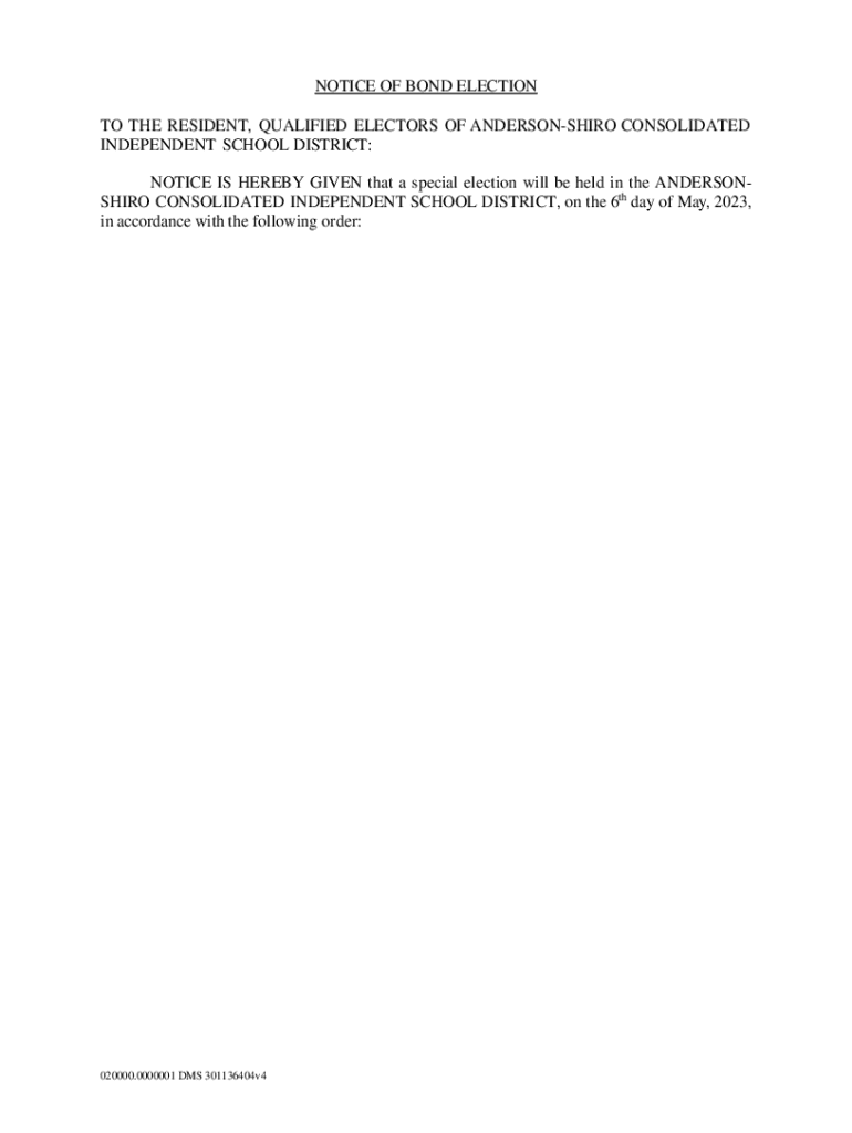 NOTICE OF BOND ELECTION TO THE RESIDENT, QUALIFIED ELECTORS OF ANDERSONSHIRO CONSOLIDATED INDEPENDENT SCHOOL DISTRICT: NOTICE IS HEREBY GIVEN that a special election will be held in the ANDERSONSHIRO
