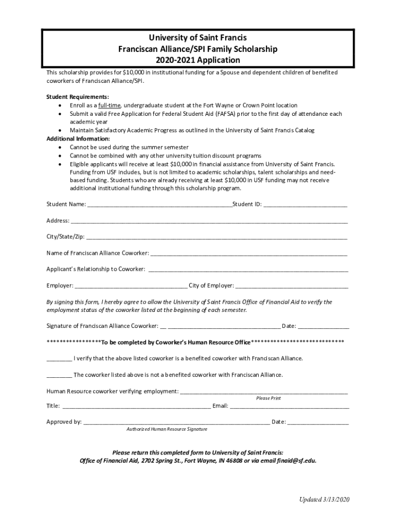 University of Saint Francis Franciscan Alliance/SPI Family Scholarship 20202021 Application This scholarship provides for $10,000 in institutional funding for a Spouse and dependent children of benefited