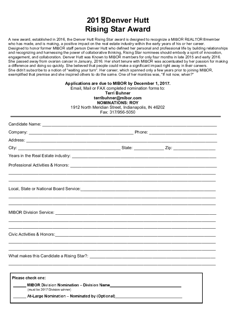 201 Denver Hunt Rising Star Award A new award, established in 2016, the Denver Hunt Rising Star award is designed to recognize a MINOR REALTORmember who has made, and is making, a positive impact