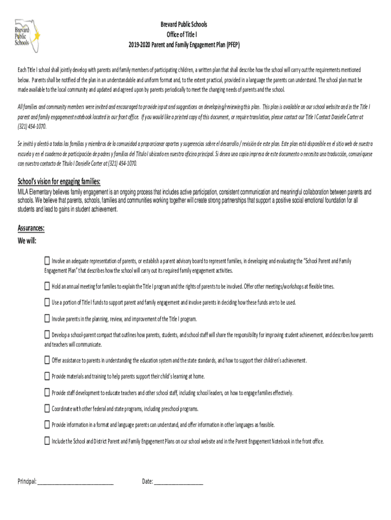Brevard Public Schools Office of Title I 20192020 Parent and Family Engagement Plan (PREP) Each Title I school shall jointly develop with parents and family members of participating children, a written