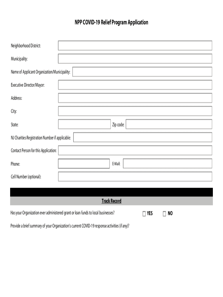 NPP COVID-19 Relief Program Application Neighborhood District: Municipality: Name of Applicant Organization/Municipality: Executive Director/Mayor: Address: City: State:Zip code:NJ Charities Registration