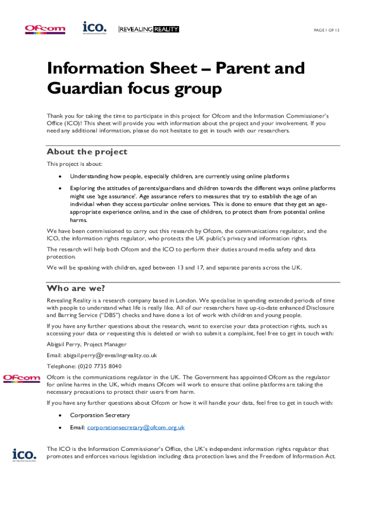 PAGE 1 OF 13Information Sheet Parent and Guardian focus group Thank you for taking the time to participate in this project for Ofcom and the Information Commissioners Office (ICO)! This sheet will