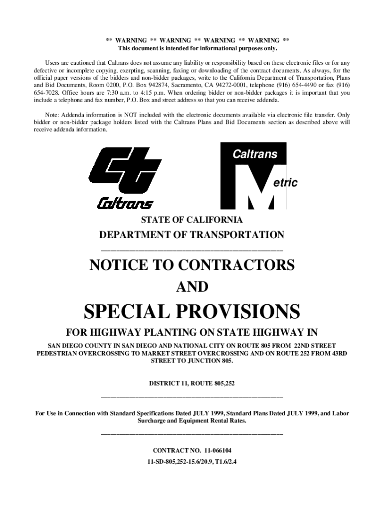** WARNING ** WARNING ** WARNING ** WARNING ** This document is intended for informational purposes only. Users are cautioned that Cal trans does not assume any liability or responsibility based on