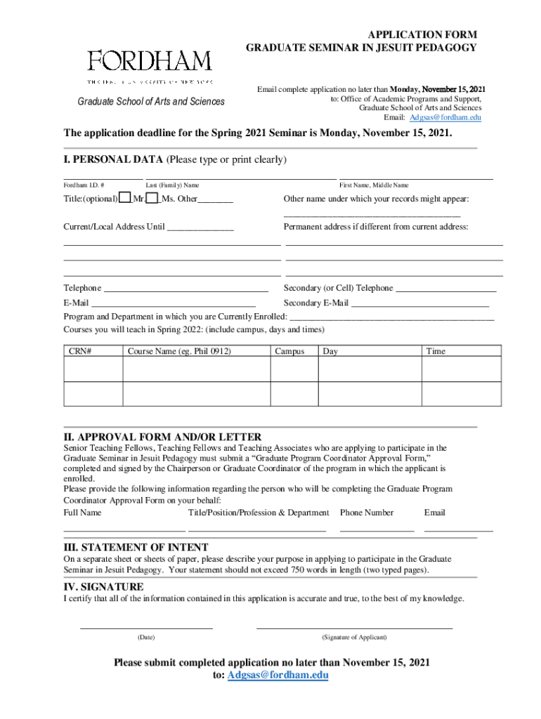APPLICATION FORM GRADUATE SEMINAR IN JESUIT PEDAGOGYGraduate School of Arts and SciencesEmail complete application no later than Monday, November 15, 2021, to: Office of Academic Programs and Support,