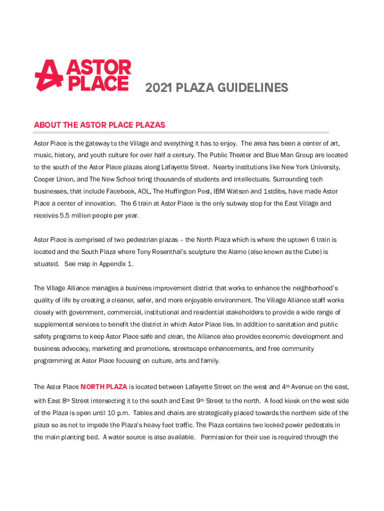 2021 PLAZA GUIDELINES ABOUT THE ASTOR PLACE PLAZAS Astor Place is the gateway to the Village and everything it has to enjoy. The area has been a center of art, music, history, and youth culture for