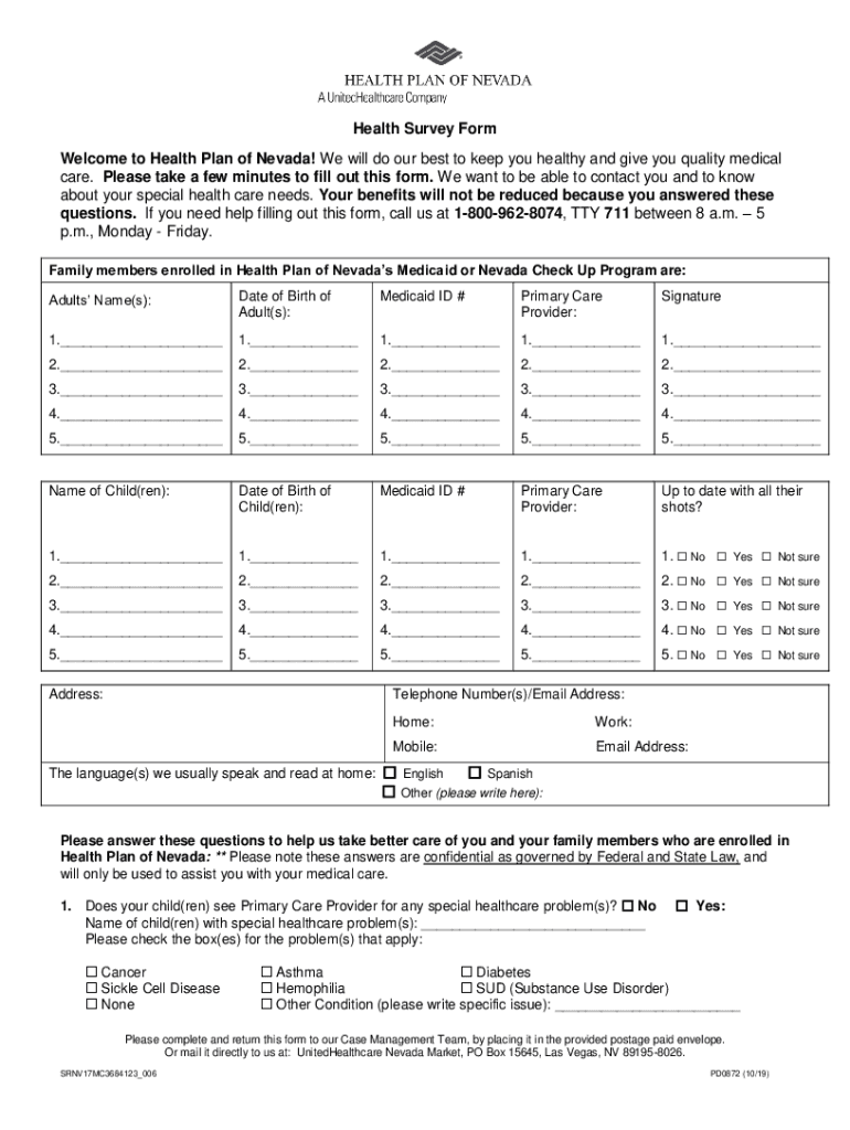 Get the free Health Survey Form - Health Plan of Nevada's Medicaid Plan