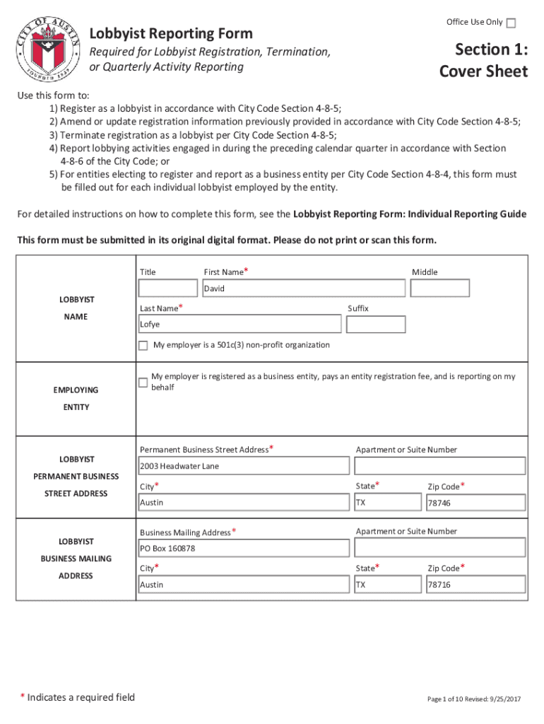 Cover SheetRequired for Lobbyist Registration, Termination,