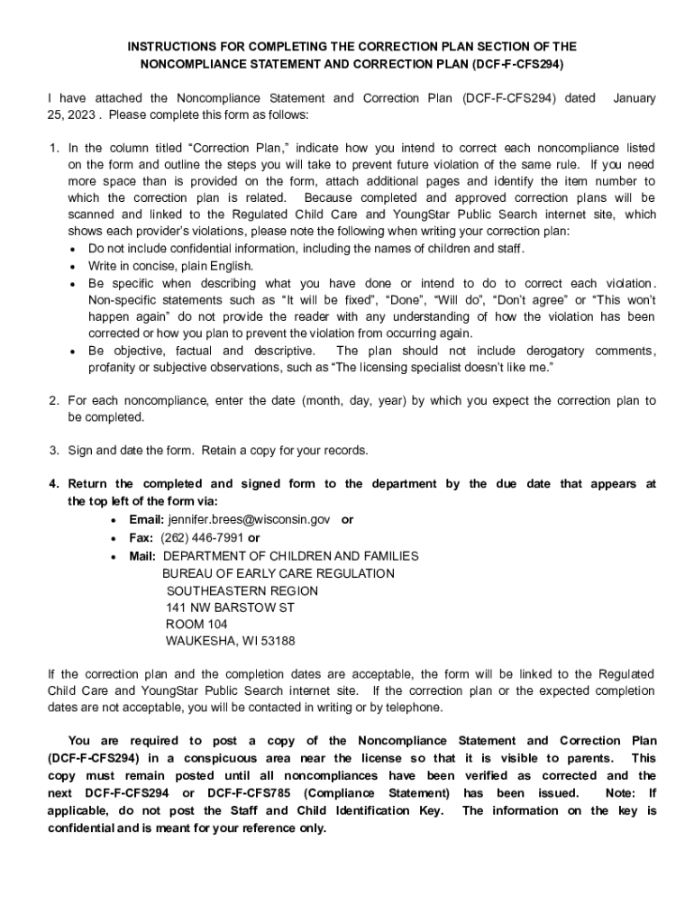 INSTRUCTIONS FOR COMPLETING THE CORRECTION PLAN SECTION OF THE NONCOMPLIANCE STATEMENT AND CORRECTION PLAN (DCFFCFS294)I have attached the Noncompliance Statement and Correction Plan (DCFFCFS294)