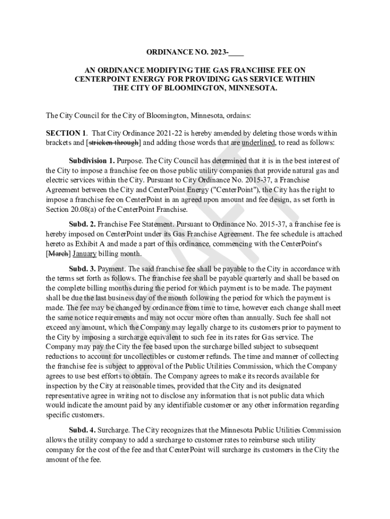 ORDINANCE NO. 2023___ AN ORDINANCE MODIFYING THE GAS FRANCHISE FEE ON COUNTERPOINT ENERGY FOR PROVIDING GAS SERVICE WITHIN THE CITY OF BLOOMINGTON, MINNESOTA. The City Council for the City of Bloomington,