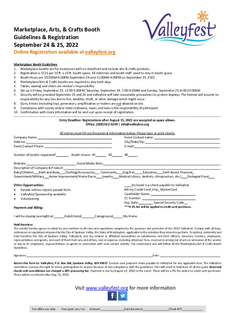 Marketplace, Arts, & Crafts Booth Guidelines & Registration September 24 & 25, 2022 Online Registration available at valley fest.org Marketplace Booth Guidelines 1. Marketplace booths are for businesses