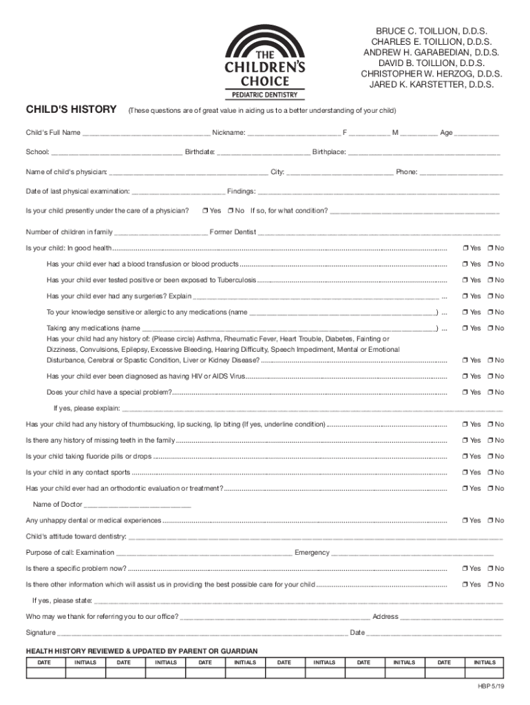 BRUCE C. TRILLION, D.D.S. CHARLES E. TRILLION, D.D.S. ANDREW H. ARABIAN, D.D.S. DAVID B. TRILLION, D.D.S. CHRISTOPHER W. HERZOG, D.D.S. Jared K. Karstetter, D.D.S.CHILD\'S HISTORY(These questions