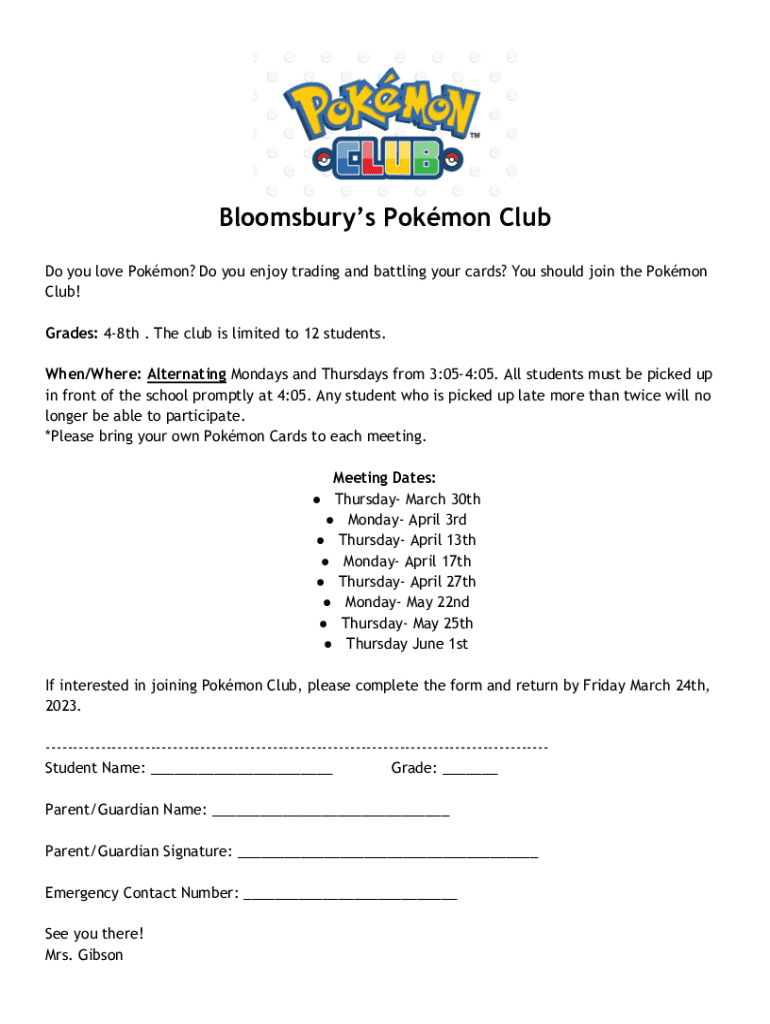 Bloomsbury's Pokémon Club Do you love Pokémon? Do you enjoy trading and battling your cards? You should join the Pokémon Club! Grades: 48th. The club is limited to 12 students. When/Where: Alternating