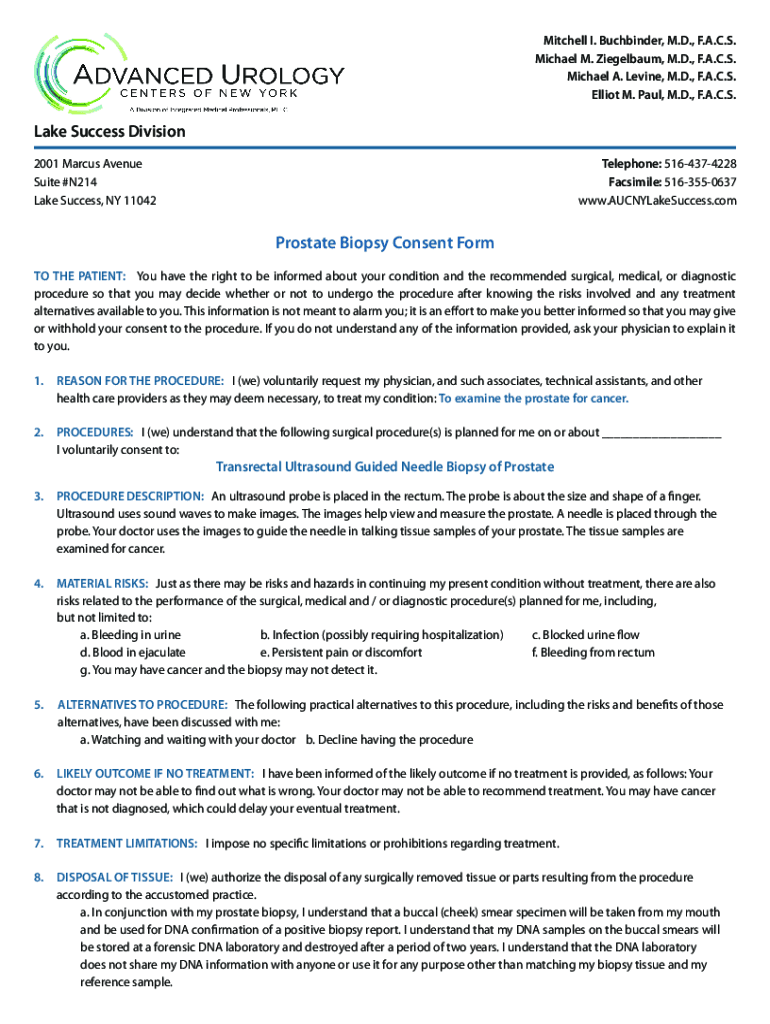 Prostate biopsy consent form is a document signed by a patient to give their explicit permission for a healthcare provider to perform a prostate biopsy.
