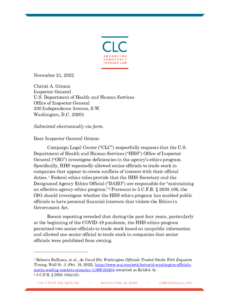 November 21, 2022, Christi A. Grimm Inspector General U.S. Department of Health and Human Services Office of Inspector General 330 Independence Avenue, S.W. Washington, D.C. 20201 Submitted electronically