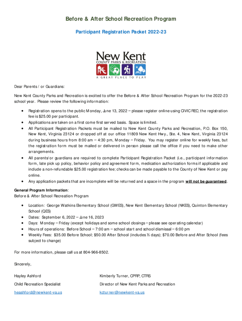 Before & After School Recreation Program Participant Registration Packet 202223Dear Parents / or Guardians: New Kent County Parks and Recreation is excited to offer the Before & After School Recreation
