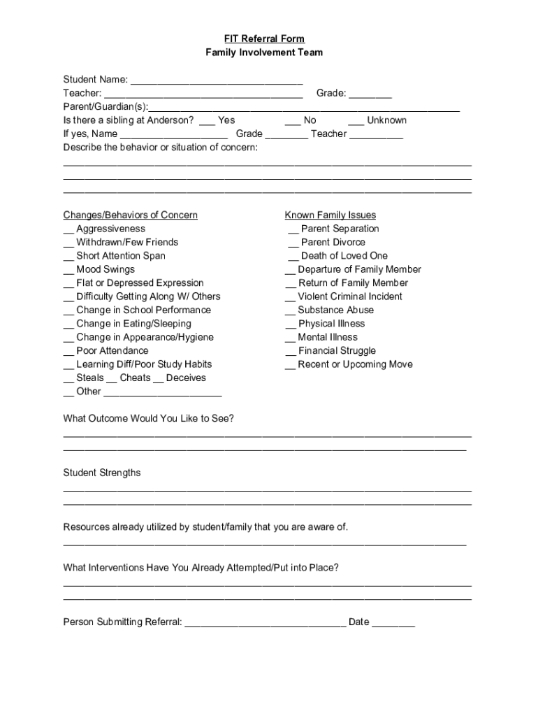 FIT Referral Formally Involvement TeamStudent Name: ___Teacher: ___ Grade: ___Parent/Guardian(s):___Is there a sibling at Anderson? ___ Yes ___ No ___ Unknown yes, Name ___ Grade ___ Teacher ___Describe