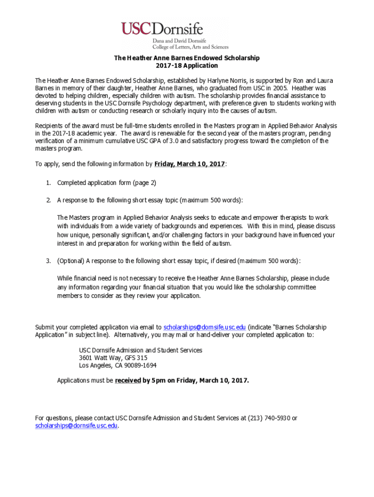 The Heather Anne Barnes Endowed Scholarship 201718 Application The Heather Anne Barnes Endowed Scholarship, established by Carlyle Norris, is supported by Ron and Laura Barnes in memory of their daughter,