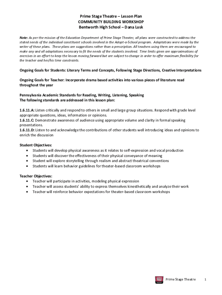 Note: As per the mission of the Education Department of Prime Stage Theater, all plans were constructed