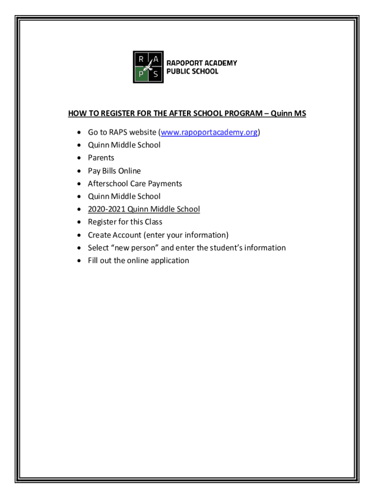 HOW TO REGISTER FOR THE AFTER SCHOOL PROGRAM Quinn MS Go to RAPS website (www.rapoportacademy.org) Quinn Middle School Parents Pay Bills Online After school Care Payments Quinn Middle School 20202021