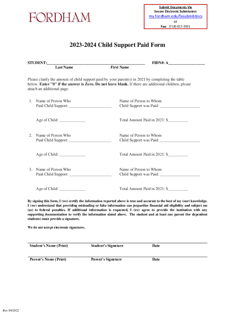 Submit Documents Via Secure Electronic Submission:my.fordham.edu/fasubmitdocs or Fax: (718) 817392120232024 Child Support Paid Form STUDENT:___ Last Name First Named#: A___Please clarify the amount