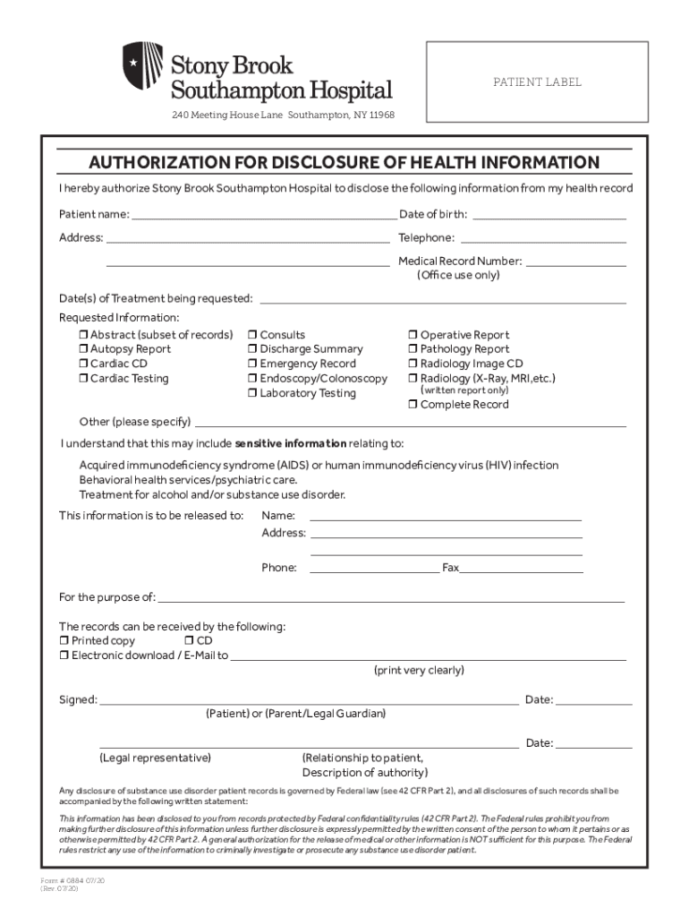 PATIENT LABEL 240 Meeting House Lane Southampton, NY 11968AUTHORIZATION FOR DISCLOSURE OF HEALTH INFORMATION hereby authorize Stony Brook Southampton Hospital to disclose the following information