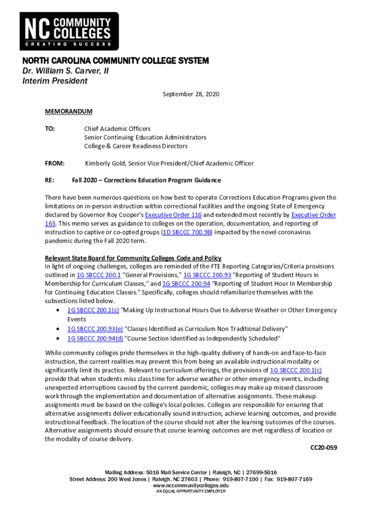 NORTH CAROLINA COMMUNITY COLLEGE SYSTEM Dr. William S. Carver, II Interim President September 28, 2020, MEMORANDUM TO:Chief Academic Officers Senior Continuing Education Administrators College & Career