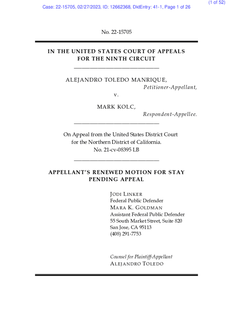 (1 of 52) Case: 2215705, 02/27/2023, ID: 12662368, Entry: 411, Page 1 of 26No. 2215705 IN THE UNITED STATES COURT OF APPEALS FOR THE NINTH CIRCUIT ___ ALEJANDRO TOLEDO ANTIQUE, PetitionerAppellant,