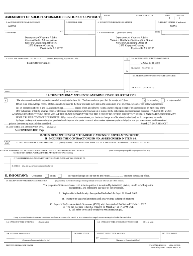 The Amendment to a Previous Combined Solicitation is a fillable form in MS Word extension needed to be submitted to the relevant address to provide some information. It must be filled-out and signed, which can be done manually, or by using a certain solution such as PDFfiller. This tool allows to complete any PDF or Word document directly in your browser, customize it according to your needs and put a legally-binding electronic signature. Right away after completion, user can send the Amendment to a Previous Combined Solicitation to the appropriate receiver, or multiple individuals via email or fax. The editable template is printable as well because of PDFfiller feature and options presented for printing out adjustment. In both electronic and physical appearance, your form will have got neat and professional outlook. Also you can save it as the template to use it later, there's no need to create a new blank form from the beginning. All that needed is to customize the ready form.