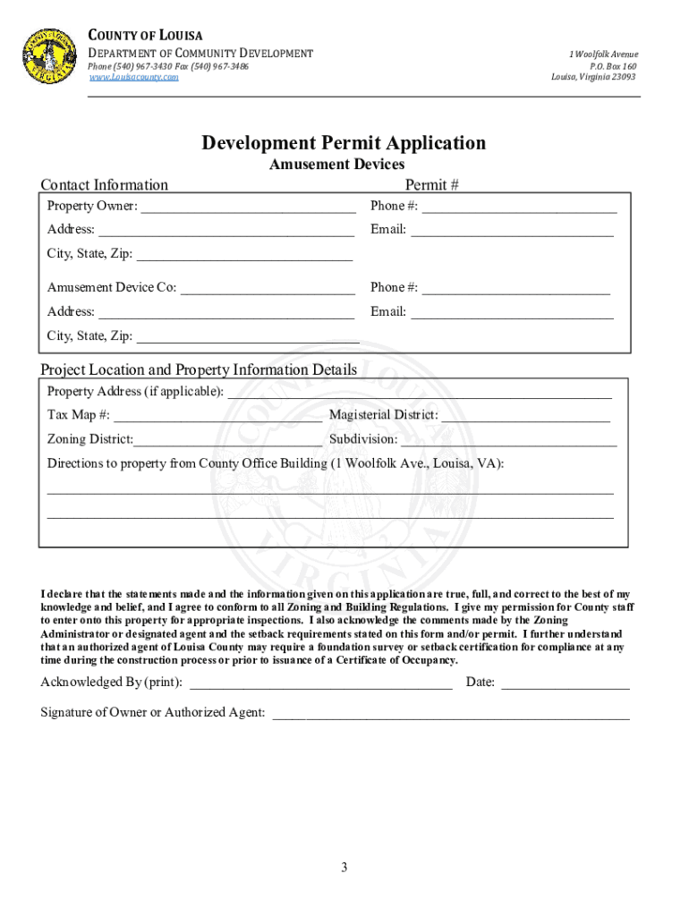COUNTY OF LOUISA DEPARTMENT OF COMMUNITY DEVELOPMENT Phone (540) 9673430 Fax (540) 9673486 www.Louisacounty.com1 Wool folk Avenue P.O. Box 160 Louisa, Virginia 23093___Amusement Devices Permit Pocketable