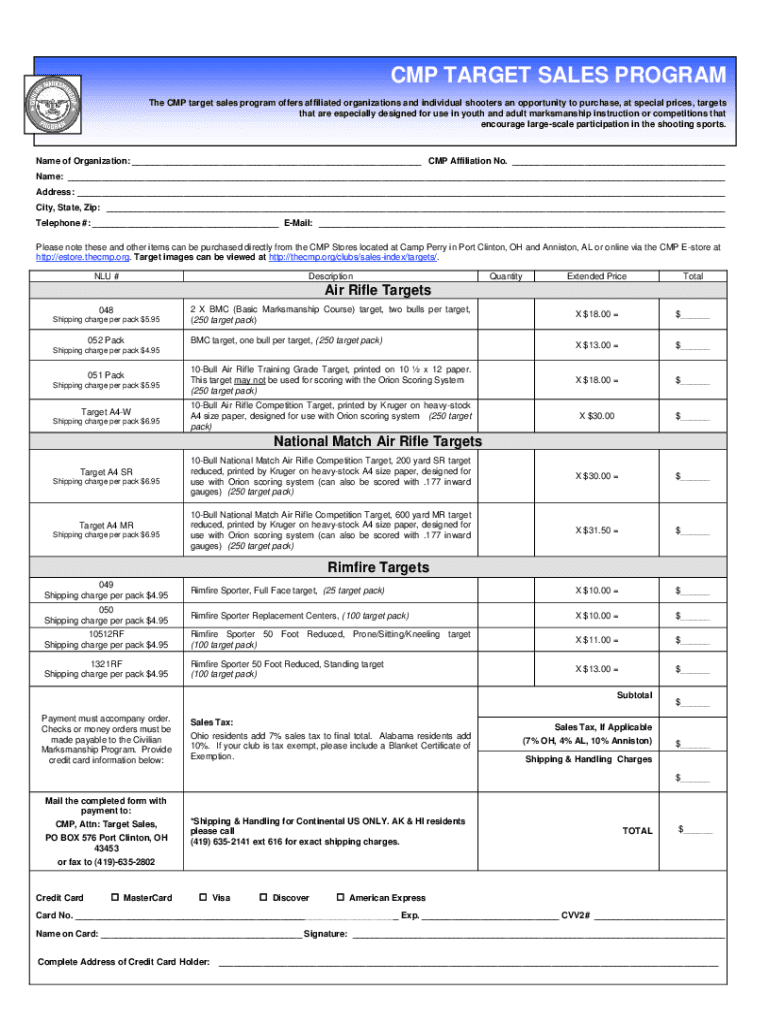 CMP TARGET SALES PROGRAM The CMP target sales program offers affiliated organizations and individual shooters an opportunity to purchase, at special prices, targets that are especially designed for