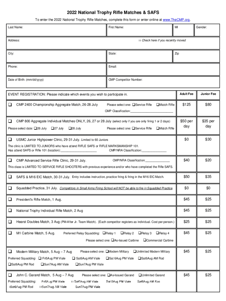 2022 National Trophy Rifle Matches & SAYS To enter the 2022 National Trophy Rifle Matches, complete this form or enter online at www.TheCMP.org. Last Name:First Name:Misaddress:Gender:Check here if