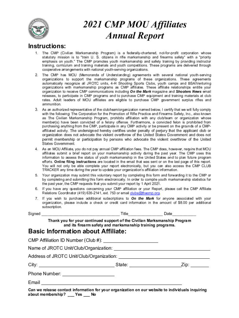 2021 CMP YOU Affiliate Annual Report Instructions: 1.2.3. The CMP (Civilian Marksmanship Program) is a federally chartered, notforprofit corporation whose statutory mission is to train U. S. citizens