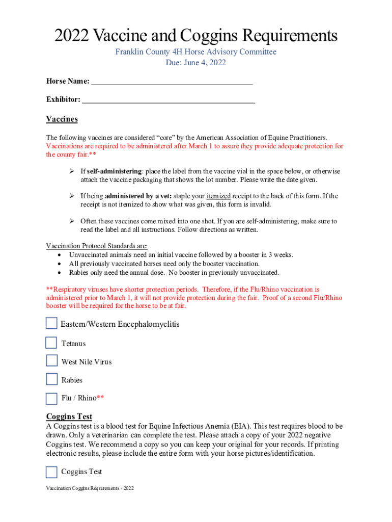 2022 Vaccine and Noggins Requirements Franklin County 4H Horse Advisory Committee Due: June 4, 2022Horse Name: ___ Exhibitor: ___Vaccines The following vaccines are considered core by the American