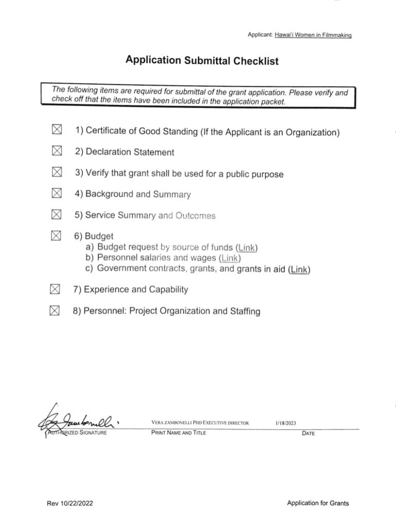 Applicant: Hawaii Women in FilmmakigngApplication Submittal Checklist The following items are required for submittal of the grant application. Please verify and check off that the items have been