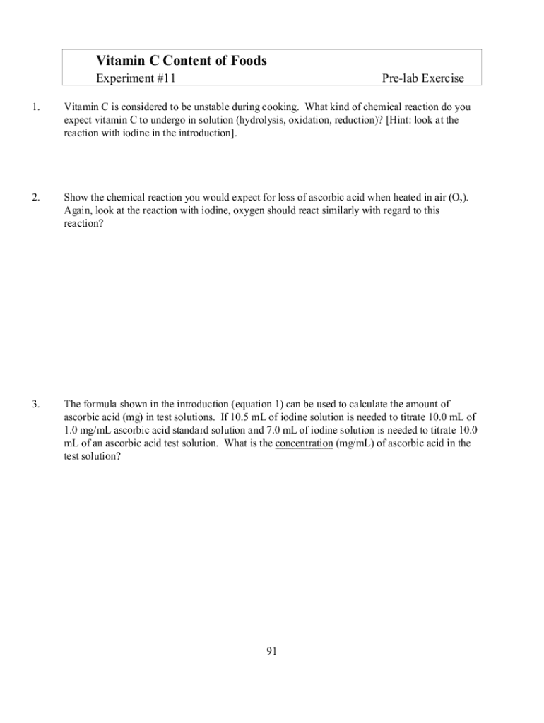Vitamin C Content of Foods Experiment #11Prelab Exercise1. Vitamin C is considered to be unstable during cooking. What kind of chemical reaction do you expect vitamin C to undergo in solution (hydrolysis,