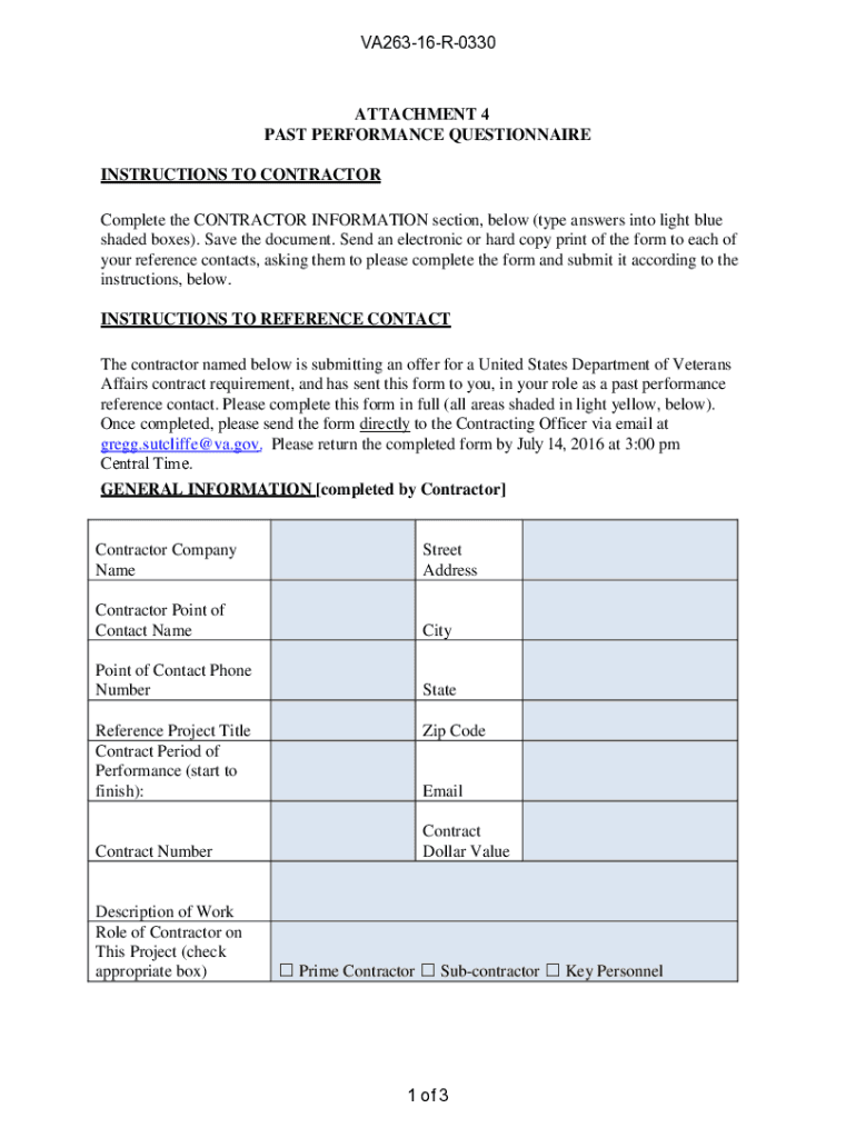 VA26316R0330ATTACHMENT 4 PAST PERFORMANCE QUESTIONNAIRE INSTRUCTIONS TO CONTRACTOR Complete the CONTRACTOR INFORMATION section, below (type answers into light blue shaded boxes). Save the document.