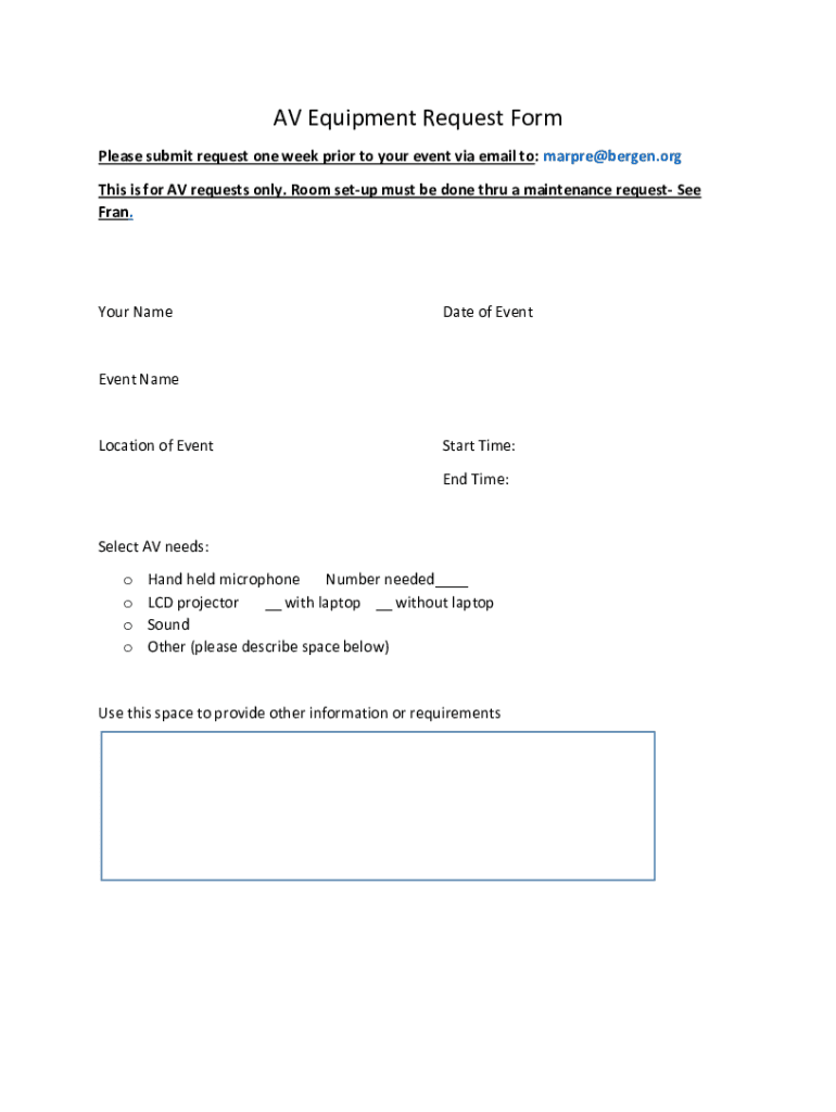 AV Equipment Request Form Please submit request one week prior to your event via email to: marpre@bergen.org This is for AV requests only. Room setup must be done through a maintenance request See