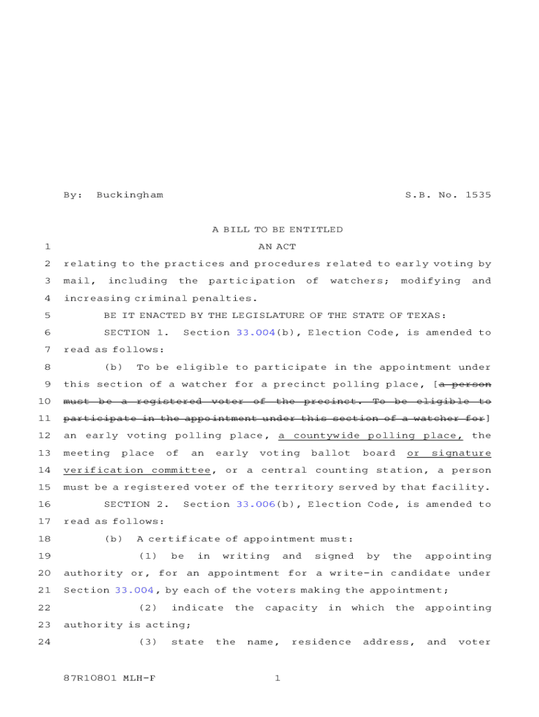 By:Buckingham. B.ANO. A1535A BILL TO BE ENTITLED 1AN ACT2relating to the practices and procedures related to early voting by3mail,4increasing criminal penalties.includingtheparticipationofwatchers;modifyingand5BE